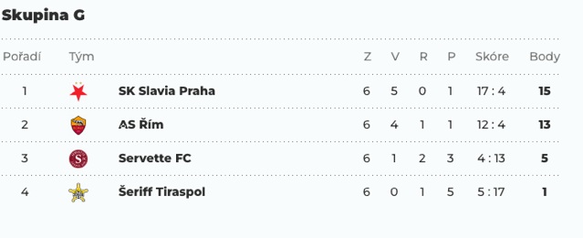 Slavia dokončila vítězné tažení Evropskou ligou. Při tom doma neprohrála, ani nedostala branku. Domácí skóre v Evropské lize je neuvěřitelné 17:0. V posledním utkání přijela do Prahy Servette Ženeva. Přední švýcarský tým v úvodu utkání vystrkoval růžky, ale po Douděrově brance hlavou to již byla jednostranná záležitost. Druhý gól připojil po Walemově střele dorážkou Ivan Shranz. V závěru prvního poločasu ještě dvakrát skóroval Mojmír Chytil. V druhém poločase si Slavia pohlídala skóre a vítězství. V druhém utkání ve skupině zvítězil AS Řím nad Tiraspolem 3:0.